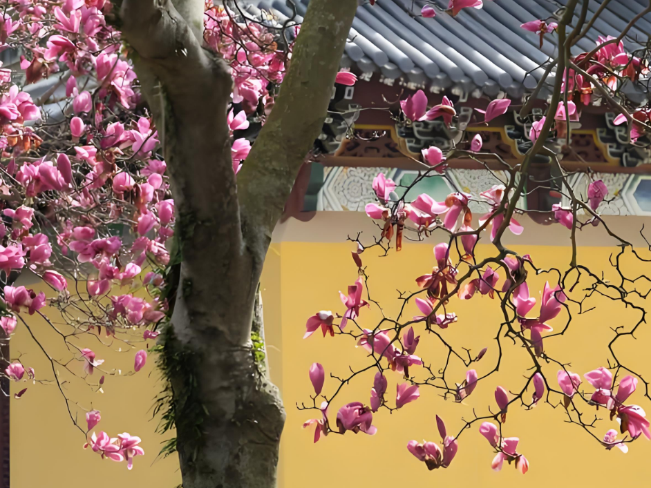 早上8:45,大巴準(zhǔn)時從園區(qū)啟程,在陽光明媚中駛向?qū)幉ㄏ笊綁︻^鎮(zhèn)舫前村。抵達智門禪寺時,茶園環(huán)繞,竹海綿延,百年紫玉蘭正值花期。大家或駐足欣賞古剎花影,或在禪寺咖啡館品鑒特色飲品,于傳統(tǒng)與現(xiàn)代交融中開啟這一天的芳菲之旅。