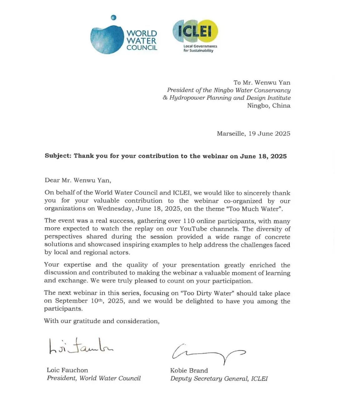 研討會(huì)圓滿落幕后,世界水理事會(huì)特向嚴(yán)文武院長發(fā)來感謝信,并盛情邀請其參加下一屆研討會(huì)。