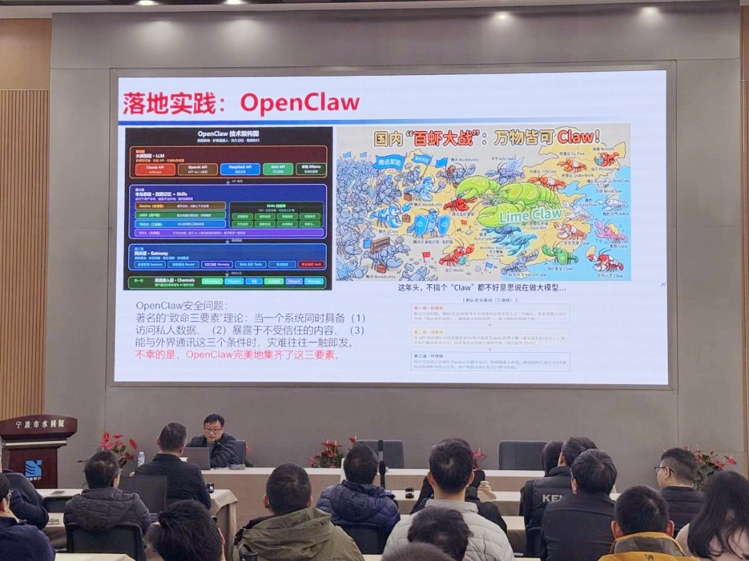 本次專題培訓(xùn)圍繞AI智能體的概念展開,簡要分析其與大模型的區(qū)別,系統(tǒng)闡述了智能體的發(fā)展歷程、構(gòu)成要素及落地實(shí)施路徑,并現(xiàn)場演示了“數(shù)智水院智能體”及當(dāng)下流行的OpenClaw等應(yīng)用實(shí)踐案例。演示環(huán)節(jié)生動(dòng)直觀,引發(fā)參訓(xùn)干部的濃厚興趣。大家紛紛表示深受啟發(fā),對AI賦能勘察設(shè)計(jì)工作有了更清晰的認(rèn)知和更強(qiáng)的信心。
