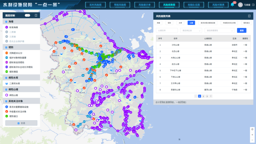 防汛抗洪,首先要摸清風(fēng)險(xiǎn)底數(shù)。每年汛前,該系統(tǒng)定期維護(hù)水庫、山塘、堤防、海塘等水利設(shè)施及搶險(xiǎn)救援信息,為風(fēng)險(xiǎn)預(yù)報(bào)預(yù)警提供基礎(chǔ)底數(shù)。調(diào)用水利設(shè)施風(fēng)險(xiǎn)研判模型,通過實(shí)時研判和創(chuàng)建預(yù)報(bào)方案計(jì)算,展示可能產(chǎn)生風(fēng)險(xiǎn)的水利設(shè)施、風(fēng)險(xiǎn)等級及相應(yīng)對策措施,形成風(fēng)險(xiǎn)提示單和預(yù)報(bào)風(fēng)險(xiǎn)圖,為搶險(xiǎn)救援提供精準(zhǔn)支撐。