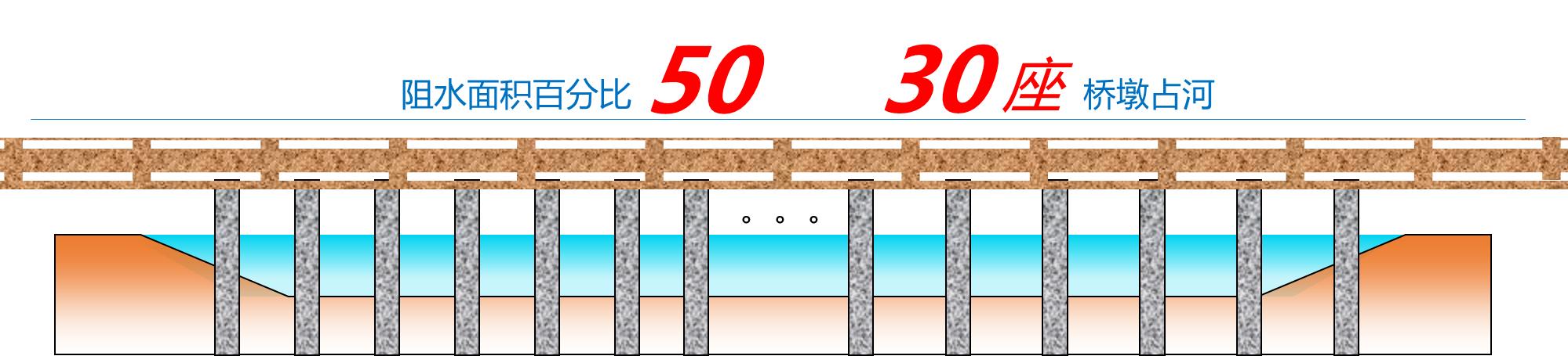 根據(jù)原設(shè)計(jì),共有30座橋墩占用河道, 20年一遇設(shè)計(jì)水位條件下,橋墩阻水面積百分比達(dá)到50%以上,不符合《浙江省涉河橋梁水利技術(shù)規(guī)定》關(guān)于“跨越III級(jí)及以下堤防以及無(wú)堤防河道的橋梁的阻水面積百分比不宜大于6%,不得超過(guò)8%。”的要求