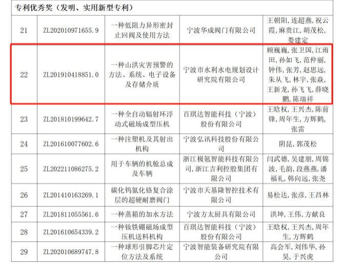 近日,寧波市市場監(jiān)督管理局公布了第三屆寧波市專利創(chuàng)新大賽獲獎(jiǎng)項(xiàng)目名單,我院提交參賽的發(fā)明專利“一種山洪災(zāi)害預(yù)警的方法、系統(tǒng)、電子設(shè)備及存儲(chǔ)介質(zhì)”榜上有名,獲得本次大賽的“專利優(yōu)秀獎(jiǎng)(發(fā)明、實(shí)用新型專利)”。